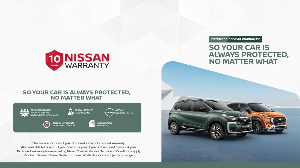 For Nissan Brand: 1) Nissan Magnite- 2yrs/ 50k km, 2) New Nissan Gravite, Magnite & Xtrail- 3yrs/ 1Lac Kms (whichever is earlier).